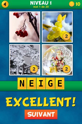 Quel est le but du jeu ? C’est simple, pour chaque jeu de chaque niveau, vous avez 1 image sur 4 qui s’affiche. A vous de trouver le mot avec les lettres qui vous sont données. Si vous calez vous pouvez découvrir une 2ème image mais dans ce cas vous gagnerez moins de points qui peuvent vous servir à révéler une lettre ou à en enlever. Si vous ne trouvez toujours pas vous pouvez cliquez jusqu’à 4 photos au total.