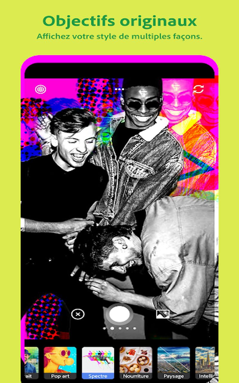 En tout, on compte plus de 80 filtres disponibles. Je ne vais pas tous les énumérer ici mais sachez qu’ils sont donc très nombreux. Autre possibilité, mais qui également disponible sur de nombreux smartphones aujourd’hui, la possibilité de corriger en direct les photos que l’on prend. Il faudra dans ce cas laisser l’application Adobe Photoshop Camera prendre les commandes de votre appareil photo.
