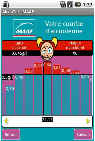 Alcootel vous informera également de l’heure indicative à laquelle vous pourrez reprendre le volant en toute sécurité. Comme pour toute application de ce genre, les résultats sont communiqués à titre indicatif. Car rappelons le, seul une prise de sang est vraiment efficace… le but étant de sensibiliser et d’informer le public.