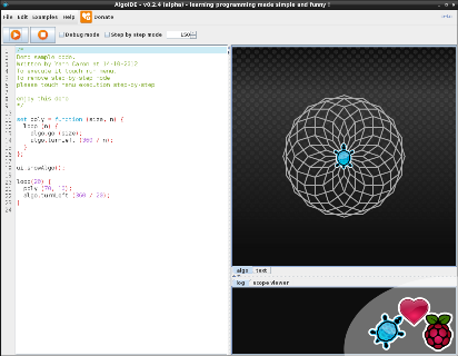 Une fois Algoid installé et ouvert, vous trouverez à gauche, un éditeur de code des plus classiques tandis qu’à droite, vous pourrez observer en direct les effets de ce code sur la petite tortue, logo de l’application. Il embarque un déboguer (debugger) temps-réel afin de corriger la syntaxe de votre code, un mode d’exécution étape par étape et un explorateur (pour une meilleur compréhension).