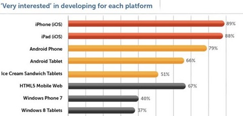 Mais la faute aussi à un intérêt grandissant pour le tout nouveau Windows qui arrive. Les développeurs précisent qu’ils sont plus intéressés par Windows 7 et le 8 qui arrive du fait du partenariat de ce dernier avec Nokia. Windows pourrait donc être un challenger de taille dans les mois ou les années à venir. A noter également la lente agonie de Blackberry qui n’en finit plus de chuter avec 16% des sondés (contre 20% il y a quelques mois).