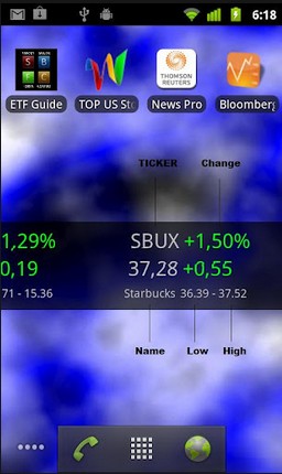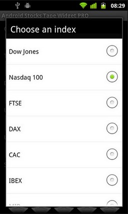 Android Stocks tape Widget existe en deux versions, une gratuite et une payante (2.99€). La version payante permet une liste d’actions favorites (5 max dans la version gratuite)