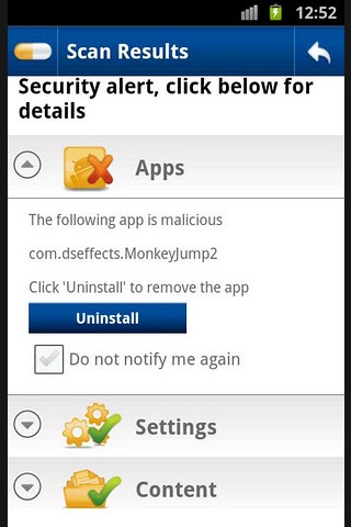 Une fois identifié, le fichier ou application « vérolé » s’affiche et vous donne même son nom. Il vous est alors fait la proposition de désinstaller ce fichier malveillant.