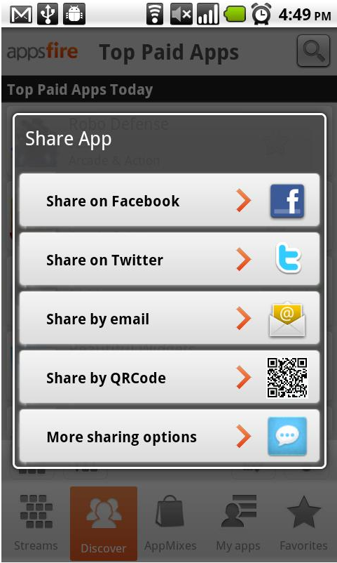 - Partagez vos apps par email, sms, twitter, Facebook et même QR code