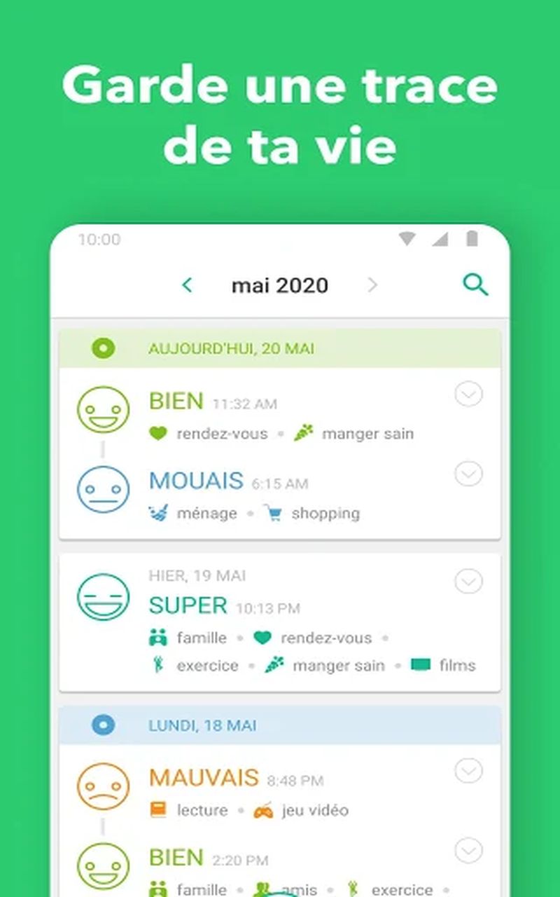 Bien réalisée et visuellement très jolie, l’application Daylio constitue un bon moyen d’écrire un petit journal intime sur mobile. Plus généralement, c’est un bon moyen de garder une trace de tout ce qu’on fait et dévaluer les effets de ces occupations sur notre humeur. En réalité c’est surtout le fait de nous « forcer » à revenir sur ce qu’on a fait et de se poser 5 minutes pour savoir si oui ou non cela nous a fait du bien. Le fait de pouvoir sauvegarder sur le Drive de Google est également une très bonne option.