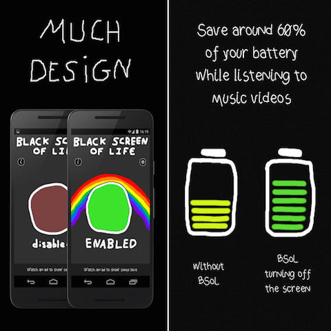 Vous avez toujours voulu éteindre l’écran de votre mobile lorsque vous écoutez des vidéos musicales, malheureusement vous avez pu vous rendre compte que la lecture s’arrête immédiatement lorsque vous verrouillez l’écran. Black Screen of Life va donc résoudre ce problème et va vous permettre d’éteindre l’écran de votre smartphone lorsque vous écoutez de la musique via une vidéo. Cela va vous permettre d’économiser énormément votre batterie, le développeur parle d’ailleurs d’une économie de 60 %.