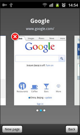 Les pages s’ouvrent rapidement. La navigation peut se faire en plein écran. Un bouton en bas à droite permet d’afficher la barre d’adresse et une barre d’outils pour naviguer entre les pages consultées, réaliser des actions sur la page courante comme la partage avec une autre application, le marquage comme favori, l’ajout d’un raccourci sur le bureau, gérer les favoris, et les différentes fenêtres ouvertes. Le bouton paramètres permet la gestion de nombreuses propriétés comme un mode nuit pour diminuer le rétro-éclairage de l’écran.