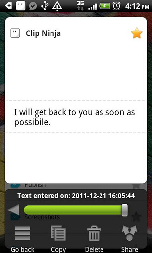 Si vous pestez lorsque vous rentrez une adresse internet dans votre navigateur mais que vous l’effacez par erreur ou bien si vous enragez après avoir écrit LE SMS de la mort qui tue mais que votre doigt l’a malencontreusement effacé, alors l’application Clip Ninja est faite pour vous: elle enregistre tout (ou presque) ce que vous écrivez.