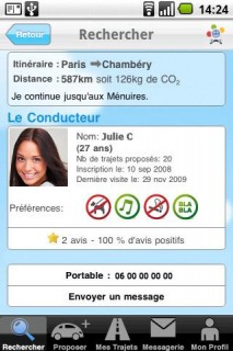 Vous pourrez rechercher un trajet par date et obtiendrez toutes les infos sur le conducteur, le type de voiture, ses préférences (non-fumeur, animaux admis, …), ainsi que les avis laissés après le covoiturage et bien sûr le tarif proposé.