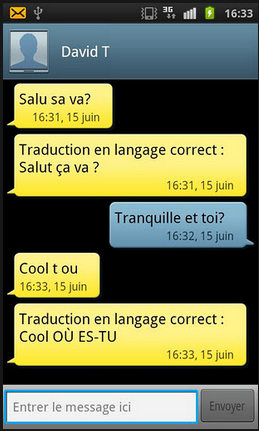 L’application Correcteur de SMS traduit automatiquement les SMS reçus en français correct. L’application corrigera dès réception, tout message mal orthographié. Il ne s’agit pas ici de corriger vos messages avant de les envoyer, mais plutôt de corriger les messages que vous recevez de la part des incultes qui vous servent d’amis et de famille.