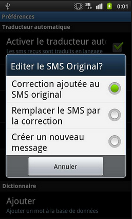 La traduction de la langue du SMS est automatique, vous pourrez choisir un seuil de tolérance (nombre d’erreurs qui déclenchent la correction), opter pour une mise à jour du SMS reçu ou créer une copie corrigée, mettre en majuscule les mots corrigés, ajouter vos propres mots pour de meilleures corrections.