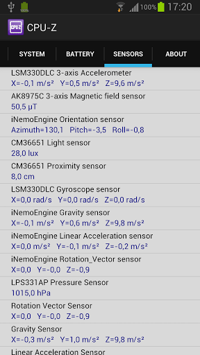 Le Soc vous fournira des informations complètes sur l’architecture des processeurs de votre Android, l’onglet System, des infos sur la résolution de votre écran, la version du kernel, la ram disponible etc, celui consacré à la Battery, comme son nom l’indique fournira des données concernant votre batterie et enfin Sensors indiquera différentes valeurs à propos de votre APN par exemple et de divers capteurs (gyroscope etc.).
