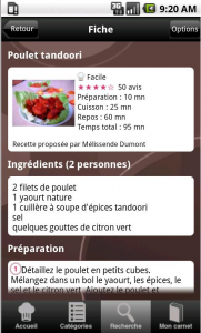 La page d’accueil propose par ailleurs des liens directs vers les différents types de plats, entrées, viandes, desserts ou autres. Vous pourrez aussi découvrir une recette au hasard en secouant votre mobile, ce qui rendra votre cuisine ludique et novatrice.