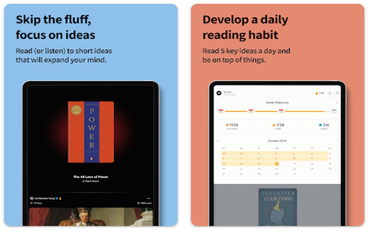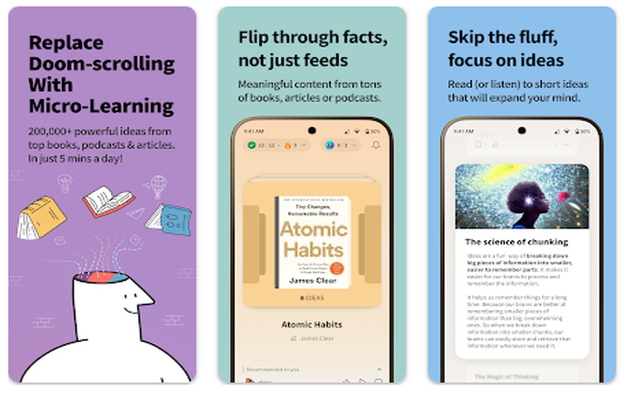Le moteur de recommandation s’affine au fil de l’usage et propose des contenus adaptés à vos centres d’intérêt : productivité, psychologie, business, créativité ou philosophie. Deepstash offre une version gratuite généreuse et une formule Premium (environ 6 €/mois en fonction des promotions) qui débloque la lecture hors ligne, des packs thématiques et des outils d’export. Parmi les atouts : condensés soignés, partage aisé, sauvegarde cloud et rythme journalier qui transforme l’accumulation d’idées en habitude. En revanche, le format ultra-court peut frustrer ceux qui cherchent des analyses profondes et la recommandation peut parfois recycler des concepts proches.