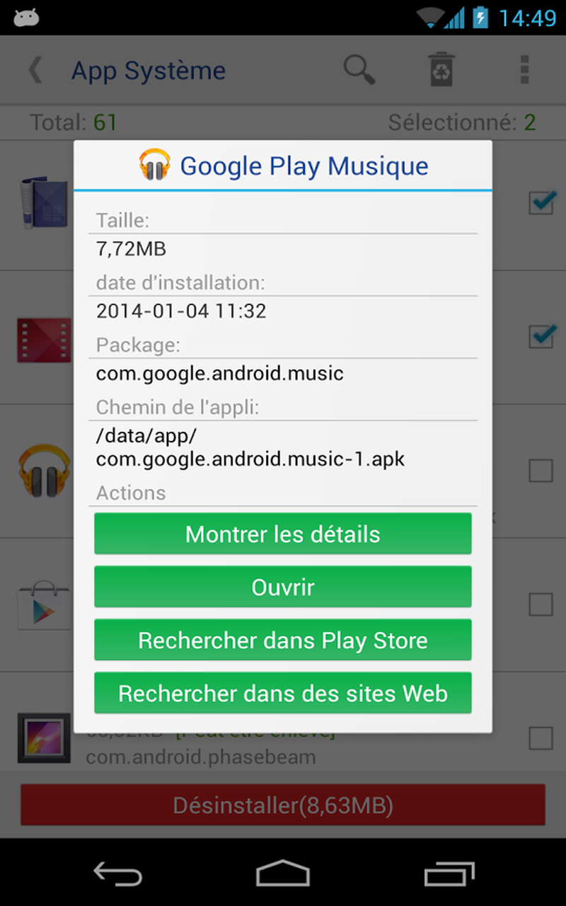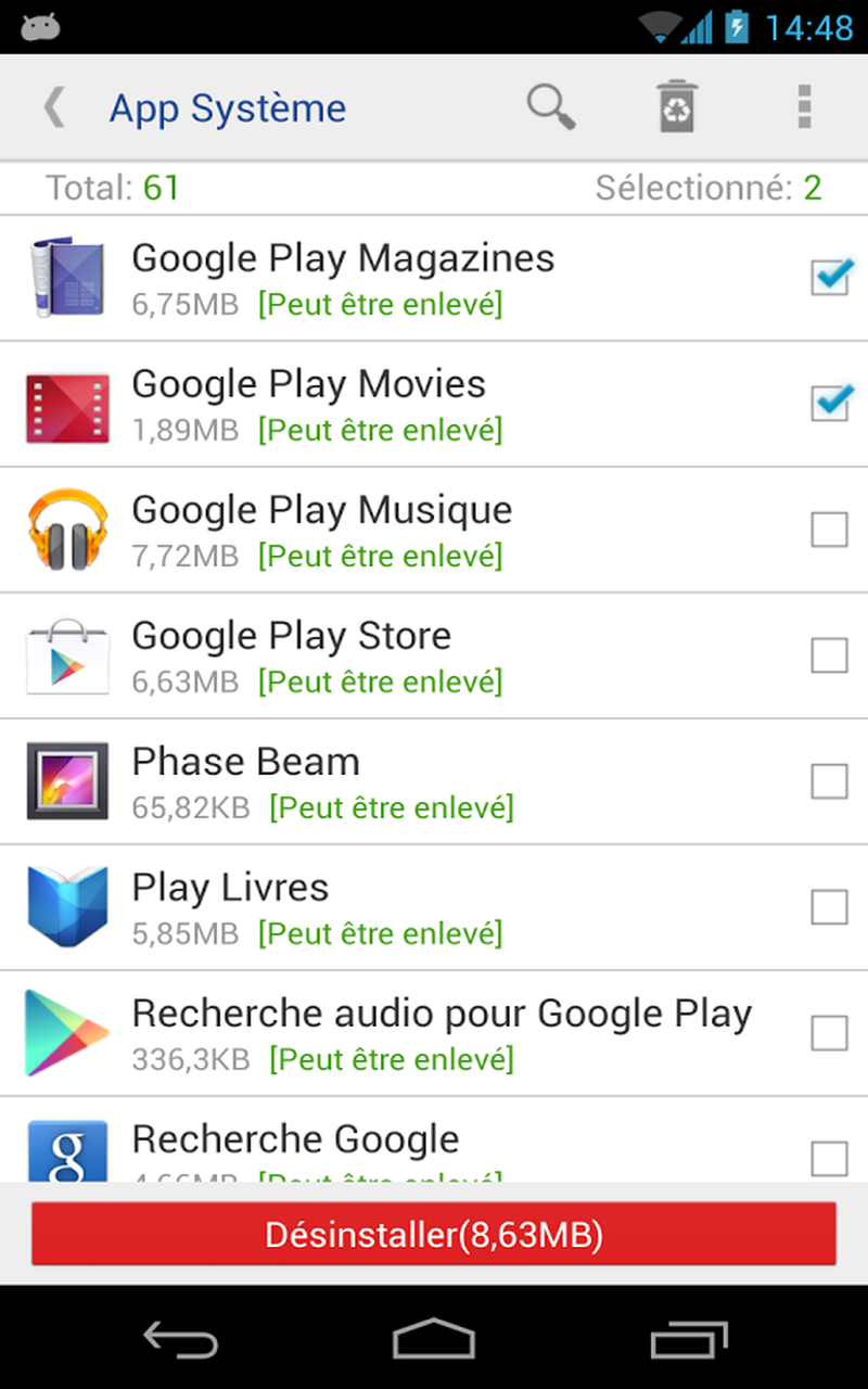 Premier élément important de Désinstalleur App Sytème, c’est le fait de pouvoir désinstaller des applications « système », autrement dit des applications installées de manière native sur votre Android et qu’en temps normal vous auriez toutes les peines à désinstaller. Ici c’est très facile puisqu’en un clic vous visualiserez les applications que vous pouvez enlever. Sachez par ailleurs que l’application est vraiment très bien faite, puisque les utilisateurs désrieux de ne pas faire n’importe quoi, visualiseront directement quelle application peut être enlevée sans risque grâce aux mentions présentes à côté des applis: « peut être enlevé », « doit être conservé », « module clé ».
