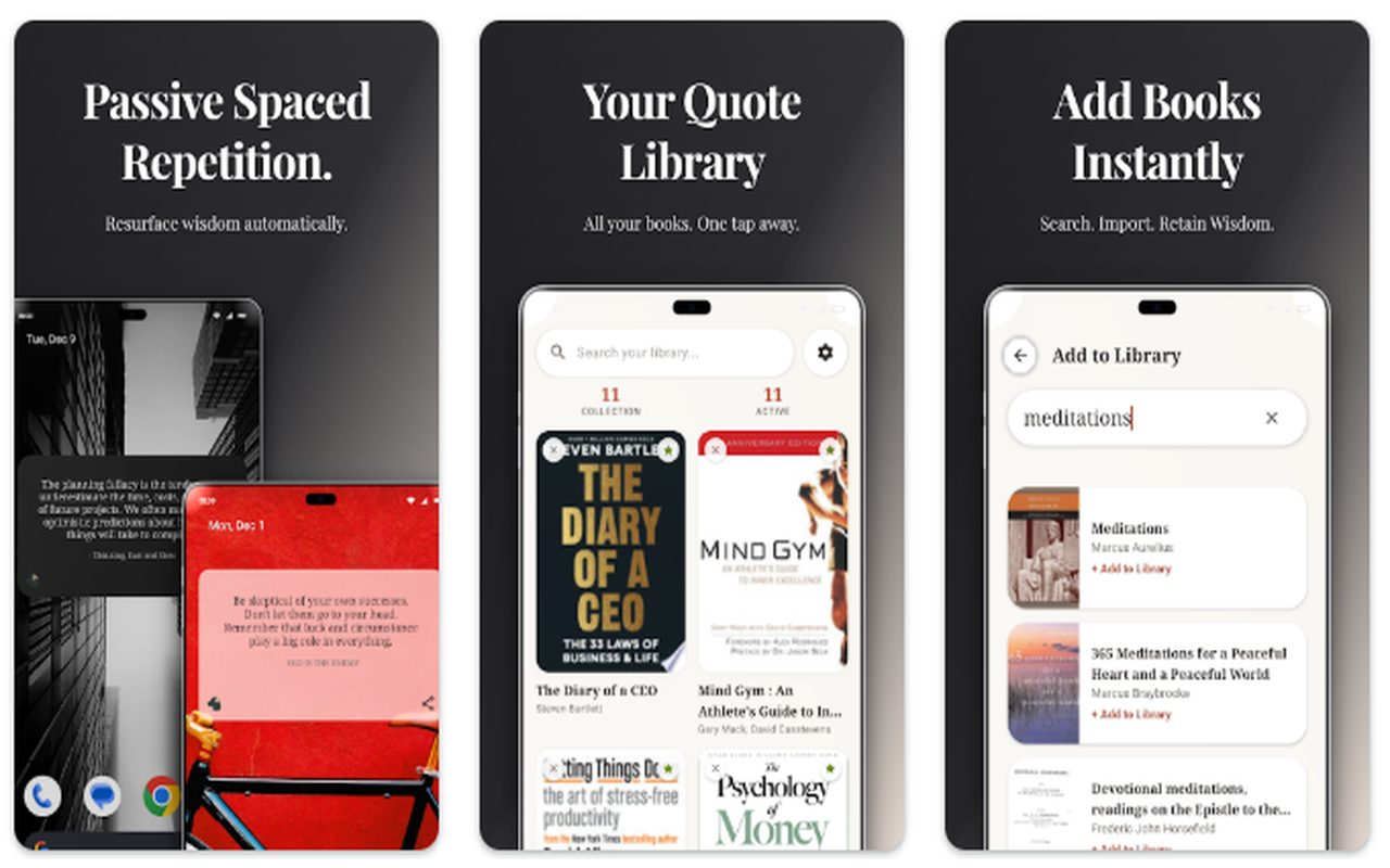 Le truc cool c’est que tu personnalises tout. Tu lis des livres de business ? Ajoute « Zero to One » pour des citations motivantes. Tu te sens anxieux ? Balance « The Power of Now » pour des pensées positives. Tu construis ta discipline ? « Can’t Hurt Me » va te pousser. L’app propose une bibliothèque complète où tu peux parcourir tes citations sauvegardées. Récemment mise à jour avec le portugais et l’arabe DogEar s’ouvre à un public mondial. Les widgets sont personnalisables avec transparence réglable et quatre polices système.