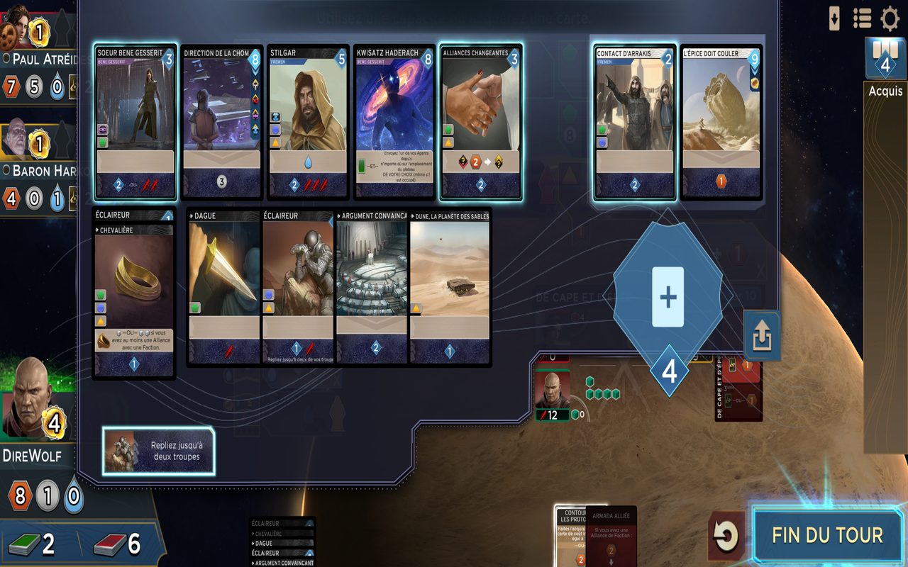 Le gameplay de ce jeu plateau stratégie Android combine plusieurs mécaniques complexes. Tu incarnes l’une des Grandes Maisons du Landsraad en lutte pour le contrôle d’Arrakis, la planète désertique source de l’Épice. Chaque carte de ta main peut soit placer un ouvrier sur le plateau, soit acheter de nouvelles cartes puissantes pour renforcer ton deck. Tu dois maintenir un équilibre stratégique entre influence politique (alliances avec l’Empereur, les Bene Gesserit, la Guilde Spatiale ou les Fremen), puissance militaire pour remporter les conflits, force économique et intrigues subtiles. Chaque round démarre un nouveau conflit sur Arrakis : tu choisis tes batailles car disperser tes forces rend tes ennemis trop puissants. Les multiples chemins vers la victoire (siège au conseil, lame affûtée, domination économique) offrent une rejouabilité infinie.