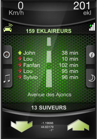 Fonctionnant sur le modèle de partage communautaire d’informations, vous êtes connecté avec plus de 130.000 personnes qui font confiance comme vous à cette application pour vous éclairer la route. Le principe est simple, l’application vous fourni le nombre d’eklaireurs devant qui vous éclairent la route. A vous d’éclairer la route des eklaireurs qui sont derrière vous.