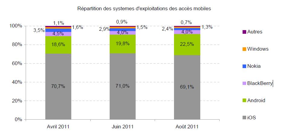 Au milieu de cette effervescence, force est de constater que comme partout ailleurs, Android poursuit sa progression avec une augmentation de 4 points en 5 mois seulement. Bien sûr l’iOS d’Apple reste le leader incontesté, pour le moment, avec 69,1% des accès aux sites via ses équipements. BackBerry reste stable avec un peu moins de 4% et Symbian (l’OS de Nokia) poursuit sa chute avec moins de 2,5% de part de marché (contre 3,5% il y cinq mois); tout comme Windows, le géant américain se contentant d’un (très petit) 1,3%.