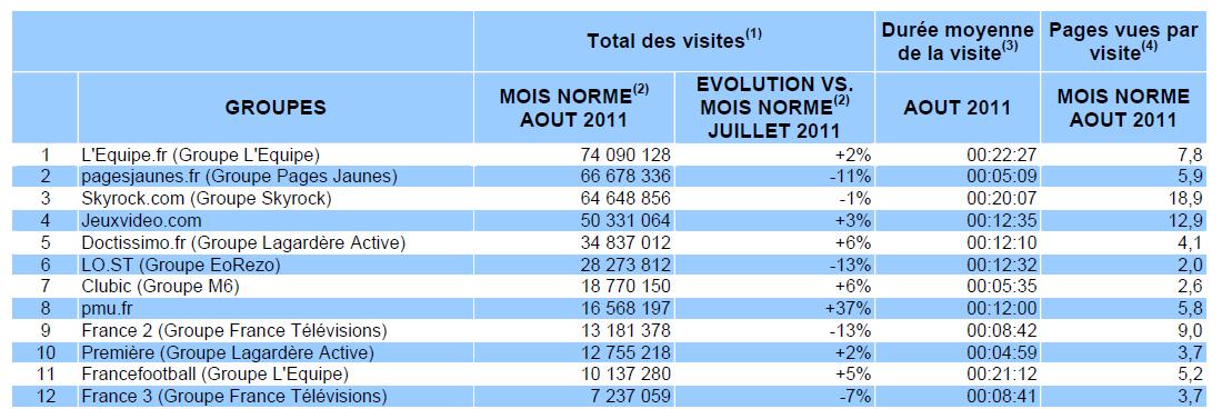 Parmi les sites les plus visités on retrouve l’Equipe.fr, les Pages Jaunes.fr, Skyrock.com, Jeuxvideo.com et Doctissimo.fr. On est donc tous des sportifs cherchant des numéros ou des adresses (!), aimant le rap, les jeuxvideo et un peu hypocondriaques. Tout va bien …