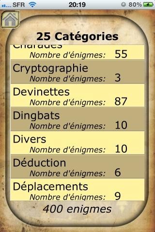 Très complet ce jeu Enigmes 2012 vous donnera accès à 25 catégories qui, à elles seules, regroupent 400 énigmes. Différents niveaux de difficultés feront que ce jeu est accessible à tous, jeunes ou moins jeunes.