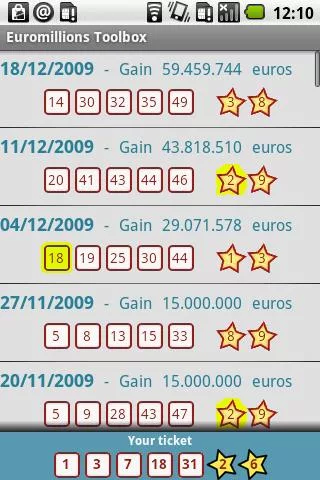 Mais ce n’est pas tout, pour ceux qui veulent optimiser leurs chances, vous aurez également la possibilité de repérer les derniers numéros qui sont sortis et de les comparer avec les vôtres. Bon c’est un peu gadget mais c’est toujours sympa de voir ça et d’essayer d’y voir une récurrence. Le petit bémol d’Euromillions Toolbox c’est que vous ne pourrez pas voir vos gains. Pour cela, il faudra aller directement chez votre buraliste. Vous pourrez donc crier tant que vous voulez dans le métro en voyant que vous avez gagner, vous ne saurez malheureusement pas la somme: dommage !