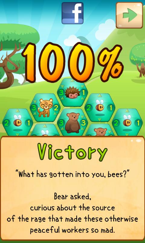 Le jeu se présente donc sous la forme de plusieurs petite formes hexagonales dispatchées sur un terrain, les mauves symbolisant les méchants que vous devez combattre et les vertes, les gentils. Le niveau est considéré comme terminé lorsque l’un des deux camps obtient plus de 50% de la zone de jeu.