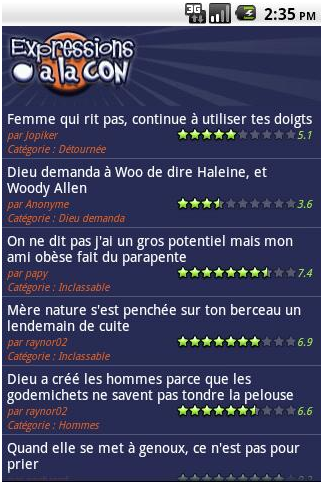 Cette application vous permet de retrouver le contenu du site éponyme, en y ajoutant des fonctionnalités propres à Android. Retrouvez les dernières expressions à la con du site www.expressionsalacon.com tout son humour sur votre téléphone Android.