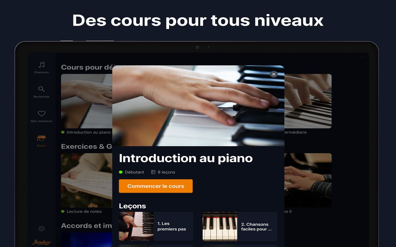 Flowkey propose une méthode structurée et motivante, organisée autour de leçons interactives et de centaines de morceaux de tous styles : classique, pop, jazz, ou musiques de films. L’app apprend à lire les partitions, à travailler la main droite et la main gauche séparément, et à améliorer la coordination. Chaque morceau peut être ralenti, rejoué en boucle ou découpé en sections, permettant un apprentissage à son rythme. L’application est gratuite dans sa version d’essai, mais la formule premium (à partir d’environ 20 € par mois, ou 120 € à l’année) débloque la totalité du catalogue et des cours avancés. Un prix qui se justifie par la qualité pédagogique et le soin apporté à la progression musicale.