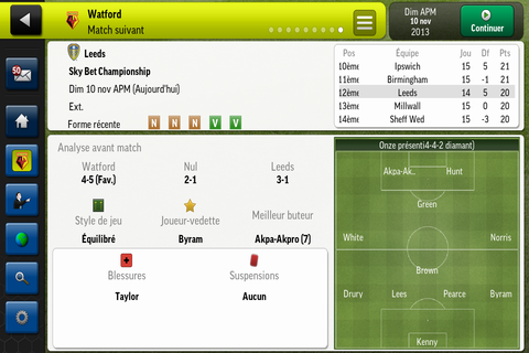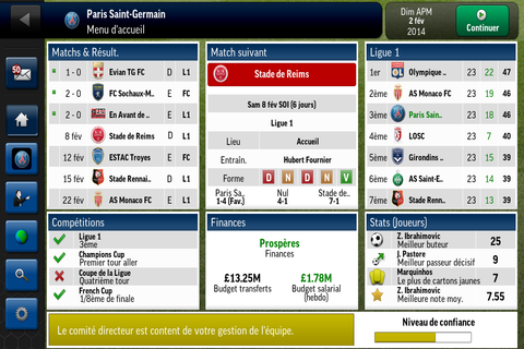 Et bien voici donc son adaptation mobile, Football Manager Handheld 2014, disponible sur Android. Autant vous le dire tout de suite, c’est une franche réussite. Le jeu est aussi soigné que l’original. Si vous ne connaissez pas le jeu, je vous conseille de commencer tout doucement en prenant les rênes d’un petit club, pourquoi pas en D2, en France ou ailleurs. Oui, c’est la première nouveauté, tant attendue, de cette version 2014, vous pouvez gérer un club de foot étranger et n’êtes plus cantonné au championnat de France. Ensuite, laissez vous guider par les menus intuitifs, en apprenant au fur et à mesure à gérer votre équipe.