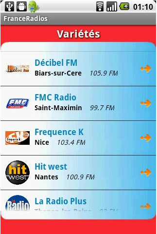 Ecoutez plus de 250 stations françaises en Ligne avec votre Mobile. FranceRadios est une application qui permet d’écouter en Live et en Streaming plus de 250 stations de radios françaises depuis votre mobile Android. Vous pouvez trouver les stations par Régions ou par Catégories (religieuses, information, culture, international, etc).