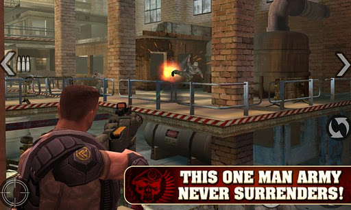 Développé par l’équipe de Glu Mobile, il s’agit donc d’un jeu de tir, mais contrairement à un FPS classique, vous voyez votre personne se déplacer, la caméra se situe juste derrière lui. Côté scénario c’est convenu: vous êtes le seul survivant d’un commando dont le but était de destituer un dictateur sanguinaire. Comme vous êtes plutôt nerveux comme garçon, vous décidez donc, plutôt que de vous barrer vite fait, de vous venger, tout seul comme un grand, un peu à la manière de Schwarzy dans « Commando », justement …