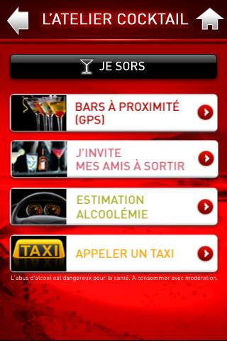Et si l’envie vous prend de prolonger votre soirée à l’extérieur, vous disposez de la rubrique « Je sors, le guide de vos sorties entre amis ». Vous y trouverez ainsi les meilleurs bars à cocktails autour de vous via la géolocalisation. L’application dispose aussi d’une fonctionnalité pour estimer votre taux d’alcoolémie (car histoire de se donner bonne conscience, je vous rappelle que l’abus d’alcool est dangereux pour la santé), et vous offre enfin la possibilité d’appeler un taxi proche de chez vous pour rentrer en toute sécurité !