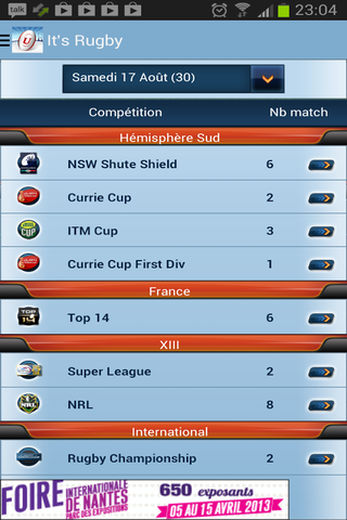 Bien réalisée, It’s rugby est tout à fait indispensable à tous les fanas de rugby. Elle a été développée par les même équipes que celles qui ont développé Handnews que nous vous avions présenté ici-même. Et bien l’application It’s rugby est d’aussi bonne qualité tout simplement. Rendez-vous compte, vous accéderez aux résultats d’une grosse quarantaine de compétitions: en France, en Europe, dans l’hémisphère sud, à XIII et pour le rugby international. C’est tout simplement ahurissant !