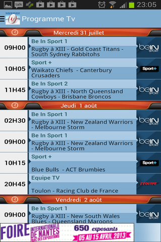 It’s rugby vous proposera trois menus. Le premier « matchs du jour », vous accéderez aux différents matchs de toutes les compétitions se déroulant un jour en particulier. Dans le second, « Compétitions », vous retrouverez tous les matchs de toutes les compétitions, avec une feuille de match détaillée, un résumé et même des fiches détaillées pour chaque joueur. Enfin, dans le menu « Programme TV », vous pourrez voir toutes les diffusions des matchs de rugby dans les 6 prochains jours et ce sur de très nombreuses chaînes: Canal +, France 2, Bein Sport etc.