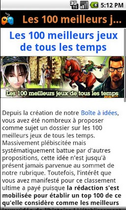 Depuis le menu principale, vous aurez accès aux actualités des jeux (nouveautés et jeux à venir), à l’actualité générale classée par catégorie, ainsi qu’aux tests complets de jeux vidéo, avec aperçus, proposés par la rédaction du site.