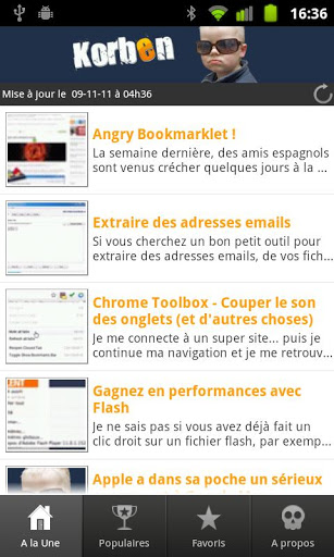 Grâce à l’application Korben, accédez aux actualités high Tech directement sur votre Android. Application officielle du site korben.info, cette appli vous propose un traitement très méticuleux de l’univers de l’informatique et de la culture geek. Si vous souhaitez être à la pointe de la technique, visitez le site ou essayez l’application, elle est gratuite et je vous jure que vous ne serez pas déçu tant le contenu est riche.