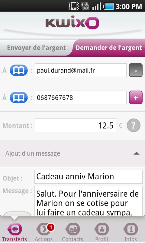 Kwixo est un nouveau système de paiement permettant d’envoyer de l’argent ou de réclamer un montant à vos amis. Une solution idéale pour rembourser une dette de restaurant, organiser l’achat d’un cadeau commun (dix personnes maximum) à l’occasion d’un anniversaire, ou faire votre shopping sur Internet.