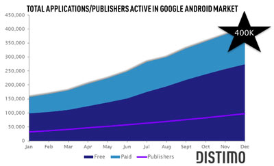 Android poursuit bel et bien son essor. L’OS est devenu la première plateforme des smartphones de la planète et de plus en plus de nouvelles applications sont crées et placées dans l’Android Market. Elles sont aujourd’hui plus de 400 000 et près de 70% d’entre elles sont gratuites. Rappelons que l’Android Market avait mis 31 mois pour atteindre les 200 000 applications disponibles et qu’en 8 mois seulement, il a doublé son offre. Ce sont désormais 100 000 éditeurs qui sont présents sur la plateforme de téléchargement de Google.