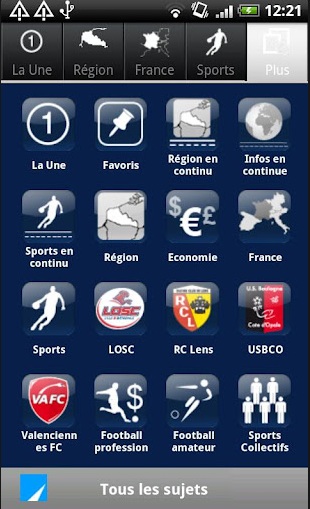 Au programme, cinq onglets, situés en haut de l’écran, offrent une navigation rapide entre les articles à la Une, l’actualité régionale et nationale, les sports, et un menu global par icônes qui vous dirigeront vers la catégorie souhaitée dont les clubs de football locaux.