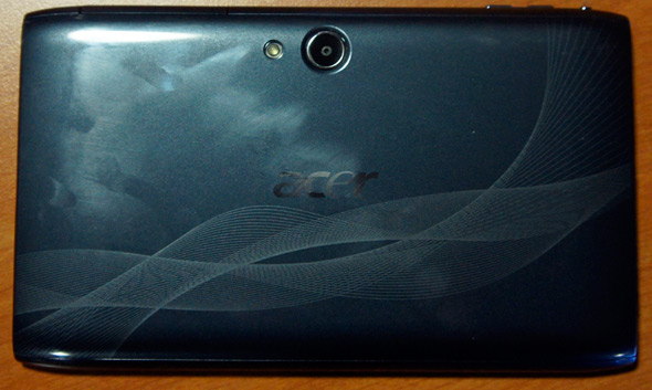 Elle semble avoir pris quelques éléments, et pas les meilleurs, des ordinateurs portables. On remarque en effet la coque arrière avec une finition plastique bleue marine. Sur celle-ci on retrouve le logo Acer gravé, pas inoubliable non plus. On trouve aussi l’APN de 5 méga pixels avec le flash LED.