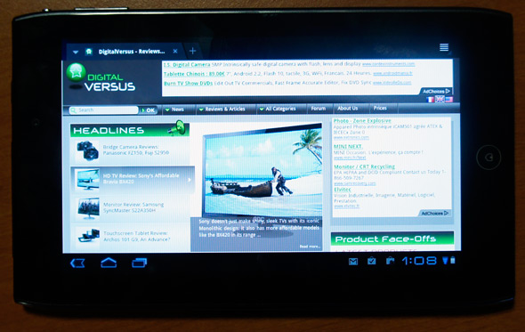 Point positif: la qualité sonore est tout à fait acceptable, le volume juste un peu faible. La lecture vidéo s’effectue sans accroche en 720p, mais les codecs font toujours défaut. Si votre vidéo n’est pas en MPEG4 ou en H 264 vous devrez passer par une application de l’Android Market. La navigation internet est elle aussi très fluide. Le zoom répond instantanément et la gestion du multi tâche est toujours aussi performante. Concernant les deux caméras, si l’APN arrière offre une qualité acceptable pour une tablette tactile (même s’il manque clairement de détails et de couleurs), il n’en est pas de même pour celui de la façade avant qui semble ajouter une teinte bleue à de nombreuses photographies. L’acquisition en 720p s’effectue également convenablement sauf si il y a de trop nombreux déplacements rapides à l’écran, ce qui crée un effet de saccade assez désagréable.