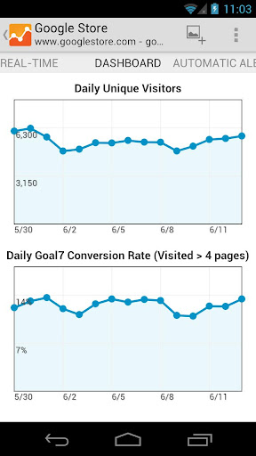 Vous retrouverez également des graphiques familiers aux utilisateurs du site web de Google Analytics présentant le nombre de visiteurs sur une période donnée.