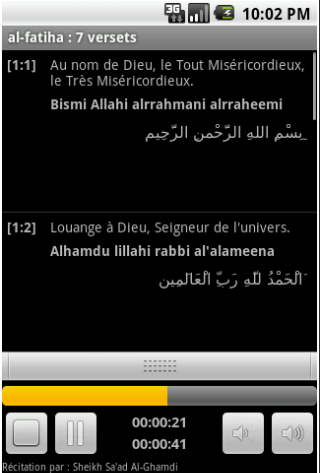 Mais aussi un système audio pour des récitation en arabe (Sheikh Sa’ad Al-Ghamdi, Sheikh Abdul Rahman Al-Sudais, Sheikh Sa’ud Ash-Shuraim, Sheikh Ali Al-Hudhaifi, Qari Abdul Basit).