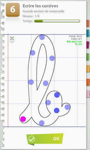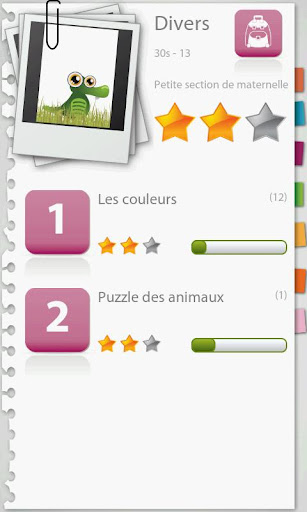 Dans chacun des thèmes, des exercices de type choix multiples, dictée, puzzle, écriture, classement et texte à trous vous sont proposés. Chaque exercice propose plusieurs dégrés pour s’adapter au niveau de chaque enfant (de bébé à superstar).