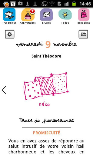 Côté pratique, Les paresseuses regorge d’outils pour les flemmardes. Vous ne pourrez plus oublier les anniversaires de vos amis grâce aux système de notifications puis leur envoyer des e-cards. Ici le choix ne se limite pas aux anniversaires, mais à tous les évènements. Le tout est complété par de bons plans et d’un système de pense-bêtes afin de noter liste de courses et autres rendez-vous importants… Pour ces derniers, vous pourrez recevoir des rappels par e-mail.
