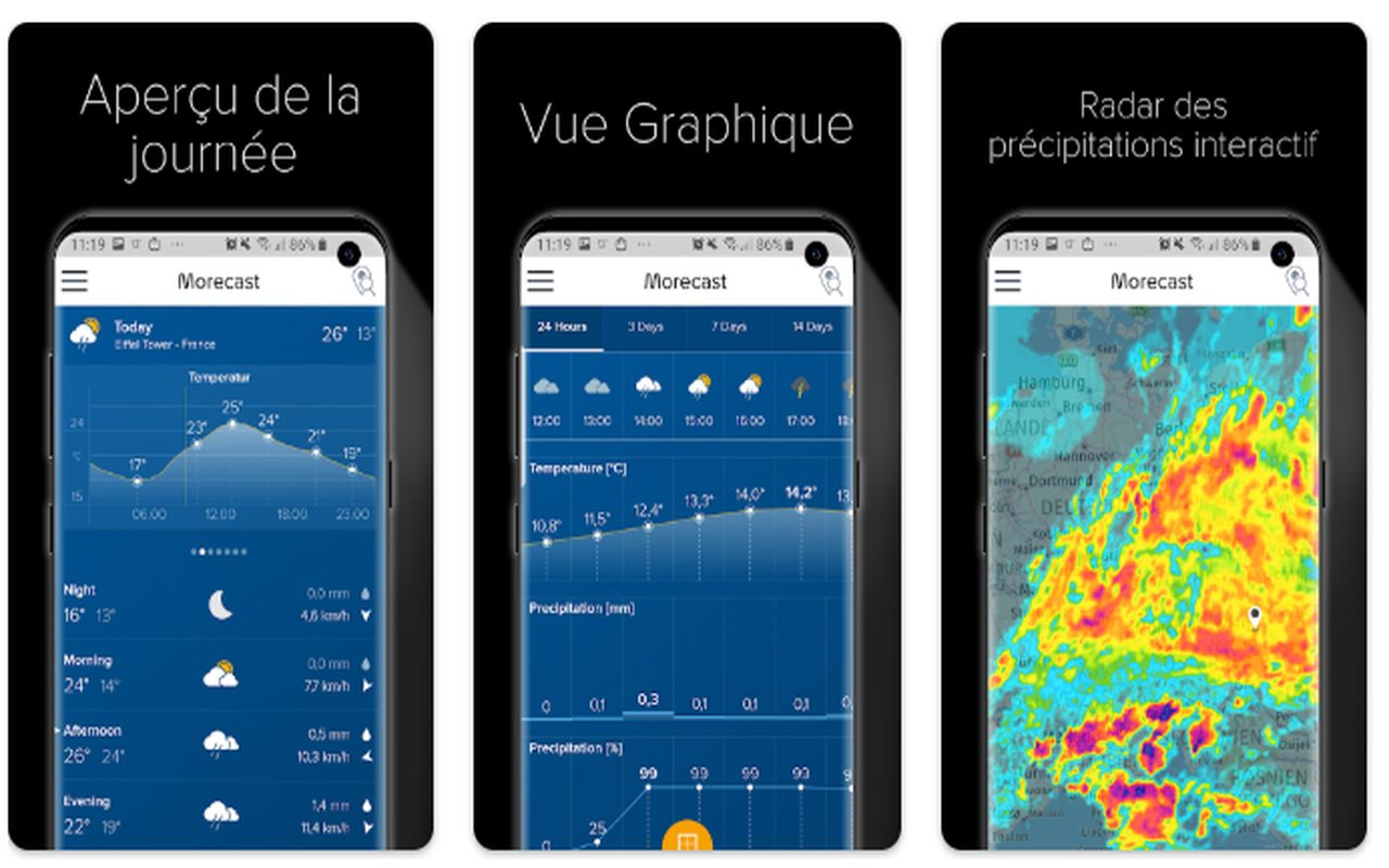 Morecast est une app météo Android qui se démarque par son suivi en temps réel de tes déplacements. Contrairement aux apps météo classiques qui affichent juste les prévisions de ta ville, Morecast utilise ton GPS pour te donner les prévisions précises là où tu es, en temps réel.