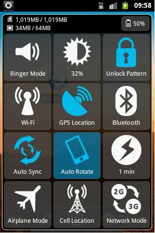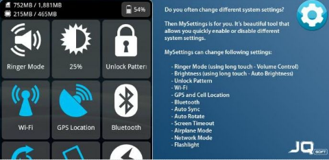 Cette application va concentrer tous les boutons de réglages de votre smartphone sur un seul écran. Si l’application MySettings reprend l’idée du widget nommé « contrôle de l’alimentation » qui permet d’activer ou désactiver le WiFi, le Bluetooth, le GPS la synchronisation en tâche de fond et l’éclairage de l’écran, l’application va plus loin dans les fonctionnalités et est donc plus poussée que le widget natif du système.