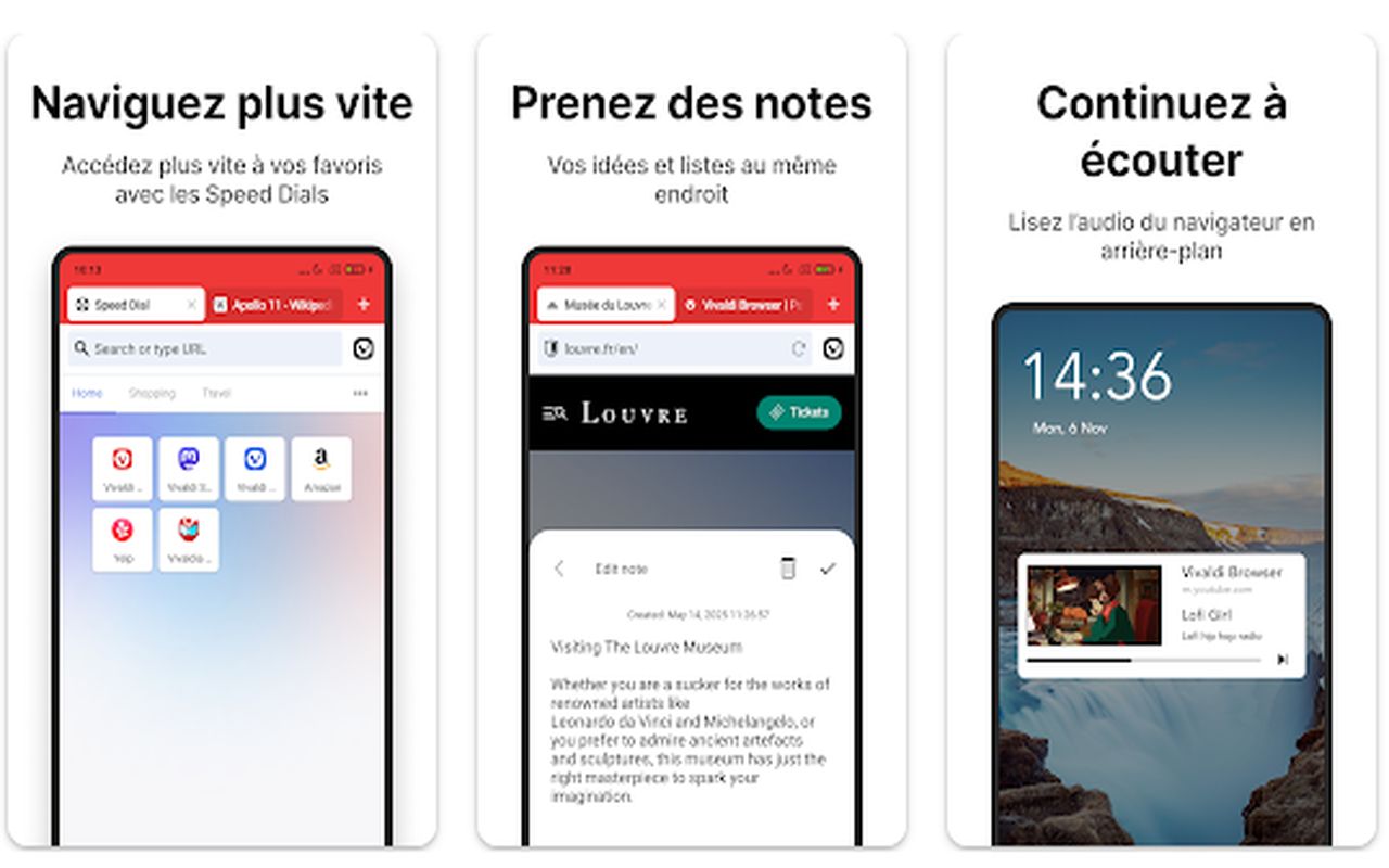 Sur Android, Vivaldi se distingue par sa palette d’outils axés sur la protection des données. Il propose un bloqueur de traqueurs intégré, la suppression automatique des données de navigation à la fermeture, la possibilité de désactiver la diffusion de l’IP via WebRTC, ou encore des options HTTPS strictes. Il permet aussi de synchroniser historiques, mots de passe, onglets, favoris et notes entre appareils de manière chiffrée de bout en bout, sans passer par les serveurs de géants externes comme Google. Sur le plan esthétique et d’usage, Vivaldi offre un outil de navigation très flexible : gestion de barres d’onglets type bureau sur tablette, organisation de « Speed Dials », thème clair/sombre, personnalisation de la barre inférieure, etc.