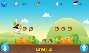 Une fois lancé, il faudra que votre ninja de poulet mange des sortes de glands, oui je sais, ce n’est pas un écureuil, mais bon c’est comme ça, et ramasse des pièces. La manipulation est très simple. En bas de votre écran, à gauche la touche pour qu’il se baisse lorsqu’il doit ramper pour saisir ce qu’il veut, celle de droite pour sauter et attraper les pièces.